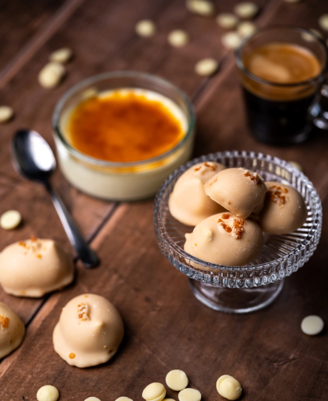 Op verzoek van velen! De witte chocolade truffel zónder alcohol. Met de heerlijke smaak van Crème Brûlée! Laat je verrassen door de romige vanille smaak mét een knisperend suikertje.