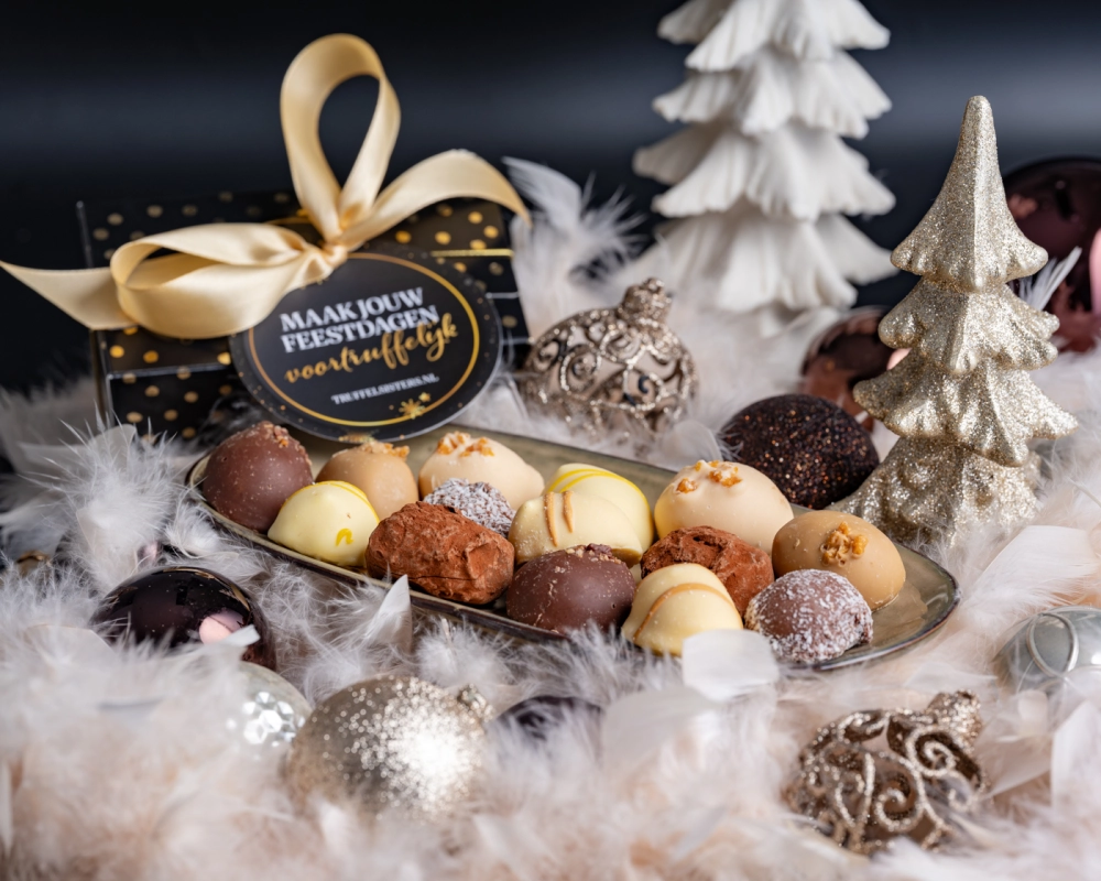 Met dit leuke cadeaupakket ontvang je van iedere smaak 1 of 2 slagroomtruffels. Een pakketje van in totaal 7 of 14 ambachtelijke truffels én een gratis kerstkaartje van de TruffelSisters.