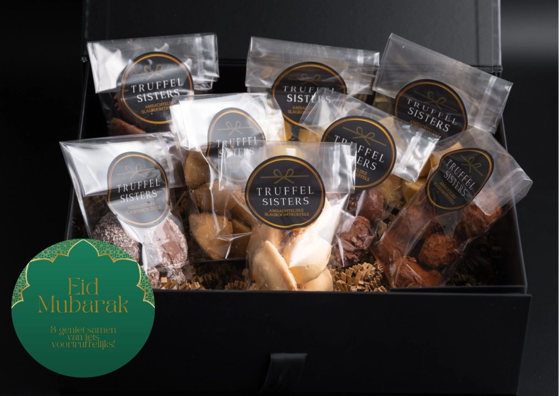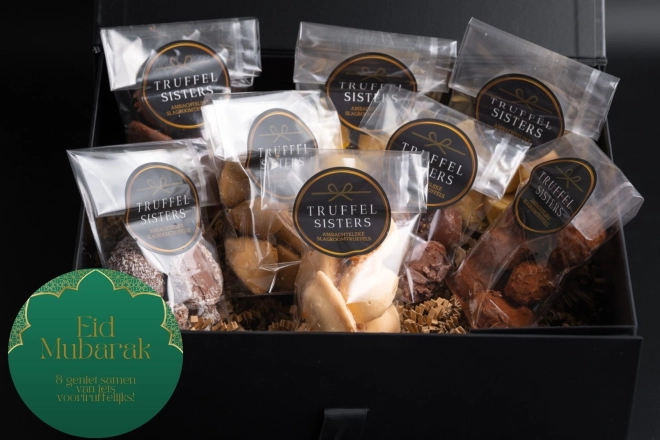 Onze feestelijke Wonderbox: een luxe cadeauverpakking gevuld met 6 zakjes van 8 handgemaakte slagroomtruffels. Een prachtig gebaar om je familie en/of vrienden een Ramadan & Eid mubarak te wensen.