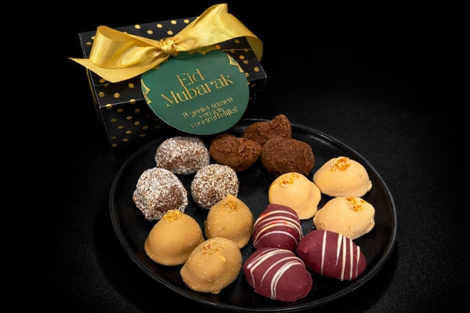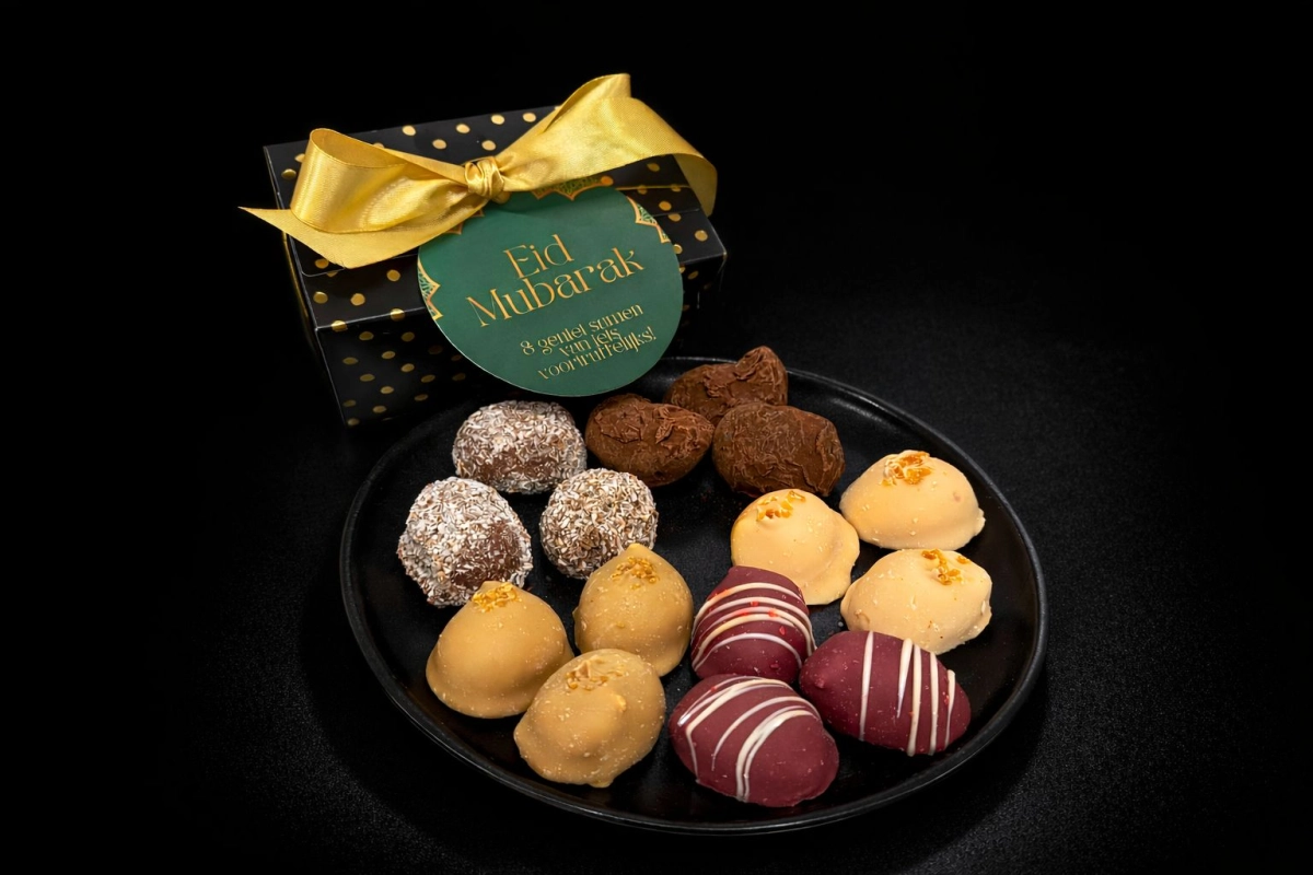 Een luxe geschenkverpakking met 15 handgemaakte slagroomtruffels. Een prachtig gebaar om je familie en/of vrienden een Ramadan & Eid mubarak te wensen.