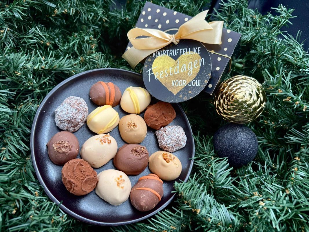 Met dit leuke cadeaupakket ontvang je van iedere smaak 1 of 2 slagroomtruffels. Een pakketje van in totaal 7 of 14 ambachtelijke truffels én een gratis kerstkaartje van de TruffelSisters.