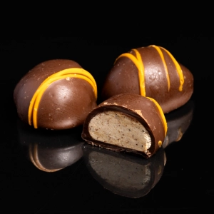 De smaak van de herfst. Als de dagen korter worden en de blaadjes vallen, is er niets zo knus als met een dekentje op de bank, een kop warme chocomel en een Pumpkin Spice truffel! Onze Pumpkin Spice Truffel is een zachte slagroomtruffel, gehuld in romige chocolade en met de smaak van de iconische herfstkruidenmix van kaneel, nootmuskaat, kruidnagel en gember.
